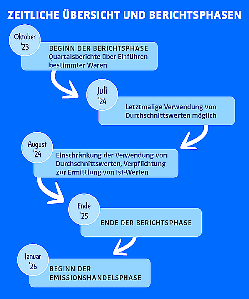 Die bis Ende 2025 laufende Berichtsphase dient als Vorbereitungszeit für den Start der eigentlichen Emissionshandelsphase im Januar 2026. Ab diesem Zeitpunkt sind Unternehmen verpflichtet, für importierte Waren am Emissionshandel teilzunehmen. Bis zum 31. Juli 2024 haben die Wirtschaftsbeteiligten noch die Möglichkeit, die in ihren Waren enthaltenen Treibhausgasemissionen anhand von Durchschnittswerten zu ermitteln. Dies kann als sanfter Einstieg in das neue System betrachtet werden. Ab August 2024 wird die Verwendung von Durchschnittswerten jedoch auf ein Minimum reduziert und von den Unternehmen wird erwartet, dass sie die tatsächlichen Emissionswerte ermitteln.