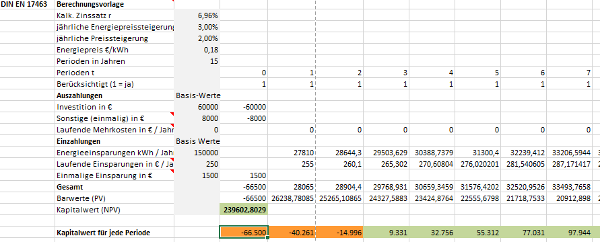 Anhang A der DIN EN 17463 erläutert im Detail die Berechnung des Kapitalwerts für das Beispiel in Tabelle 6 der Norm. Das diesem Beitrag beigefügte Tool ist in Anlehnung an diese Anleitung entstanden und weicht nur in zwei Punkten ab:[