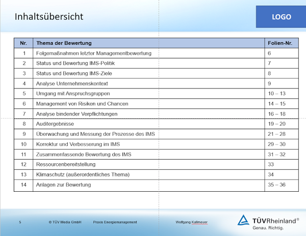 Außerdem erhalten Sie Hinweise, in welchen Schritten und mit welchen Methoden Sie die Managementbewertung in der Praxis gestalten können. Auch die Freiräume, die Sie haben, um dabei den Bedürfnissen ihrer Organisation gerecht zu werden, werden aufgezeigt. Der Umgang mit der Managementbewertung im Nachgang ist ebenso Thema, damit Ihre Organisation daraus den größtmöglichen Nutzen ziehen kann.