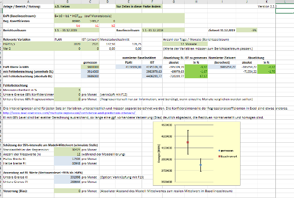 Nicht im Original dargestellt sind die Fehlerbalken in Abbildung 1. Das heißt aber nicht, dass diese nur „nice to have” sind. Grundsätzlich gehört eine Fehlerbetrachtung zu jedem messtechnischen Arbeiten. ISO 50001:2018 erwartet, dass „die zur Messung von Hauptmerkmalen verwendete Ausrüstung Daten bereitstellt, die genau und wiederholbar sind” (6.6). In Anhang A.9.1 wird sie konkreter: „Bei der Durchführung von Analysen sollte den Einschränkungen der Daten (Genauigkeit, Präzision, Messunsicherheit) und der Konsistenz der Energiedatenerfassung Rechnung getragen werden, bevor endgültige Schlussfolgerungen gezogen werden.”