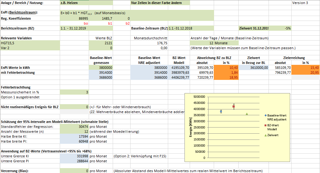 Anpassungen für Variable lassen sich durch die Erstellung von Modellen und anschließender Normierung der Baseline- bzw. EnPI-Werte relativ leicht durchführen (s. Kap. 05312). Bei den ermittelten Verbrauchsdifferenzen zwischen Baseline-Zeitraum (BLZ) und Berichtszeitraum (BZ) bleibt jedoch oft unklar, ob es sich um das Ergebnis von Energieeinsparmaßnahmen handelt oder um ein NRE bzw. eine Kombination aus beiden. Hinzu kommen noch Mess- und Modellunsicherheiten, wobei Letztere nicht relevante Variable, kleinere Projekte und unwesentliche NRE enthalten können, die im Rauschen untergehen.