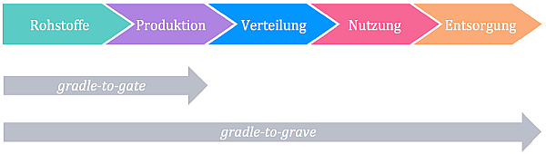 Was bedeutet eigentlich „CO2-Fußabdruck”? Der „CO2-Fußabdruck” (engl.: „Carbon Footprint”) gibt die Menge an Treibhausgasemissionen an, die beispielsweise eine Person, eine Organisation oder eine Veranstaltung direkt oder indirekt verursacht [4]. Dabei ist „CO2-Fußabdruck” eine Weiterentwicklung des Begriffs „ökologischer Fußabdruck”, der in den 1990er-Jahren entstand. In dieser Zeit wurde auch die Serie ISO 14040 ff. veröffentlicht. Die Norm regelt die Erstellung produktbezogener Ökobilanzen (engl.: LCA – Life Cycle Assessment) und dient u. a. der Erfassung aller Stoff- und Energieströme, die im Laufe eines Produktlebenszyklus entstehen. Dabei bezeichnet der Produktlebenszyklus die Rohstoffgewinnung, Herstellung, Nutzung und Entsorgung eines Produkts, also „from cradle to grave” (zu Deutsch: „von der Wiege bis zur Bahre”). Der häufig verwendete Begriff „cradle to gate” umfasst demgegenüber die Untersuchung der ersten beiden Lebenszyklen (Rohstoffgewinnung und Herstellung) und stellt keine vollständige Ökobilanz dar (s. Abb. 1).